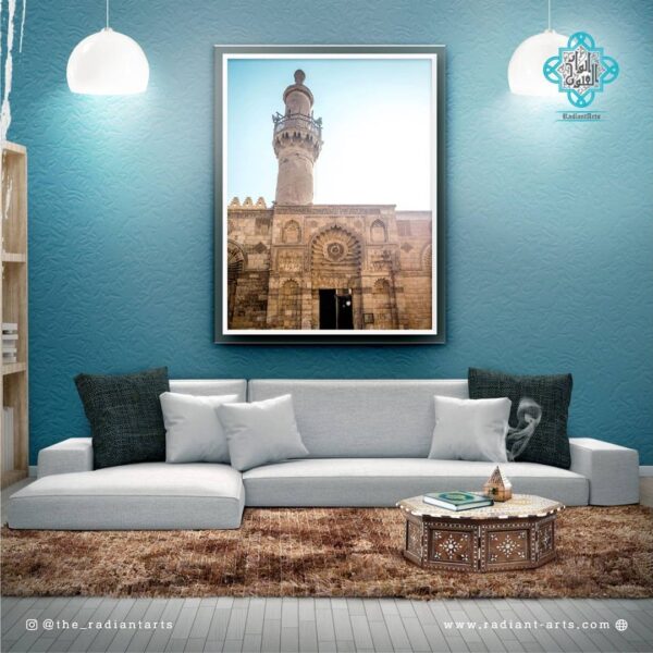 This painting depicts the sublime rotated square, which boasts reflective symmetry on multiple axes, adorns the monumental portal of al-Jami al-Anwar. It was recreated from remnants of an original square that was preserved on a recessed wall panel in the form of a blind niche on the north-eastern side of the portal. This recessed panel came to light in 1324/1907 due to conservation work undertaken on the façade of this Jami masjid. This discovery further established that Maulana al-Imam al-Hakim AS deliberately chose to emphasize the main entrance to the masjid through the use of a projecting portal and also highlighted its significance through detailed ornamentation. Today, the monumental portal of al-Jami al-Anwar stands resplendent due to the accomplishments of His Holiness Dr Syedna Mohammed Burhanuddin RA and his successor, His Holiness Dr Syedna Mufaddal Saifuddin TUS. (Adapted from information extracted from pages 284-94 of ‘al-Jami al-Anwar–The Luminous Masjid’)