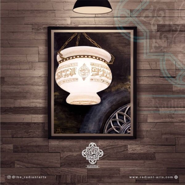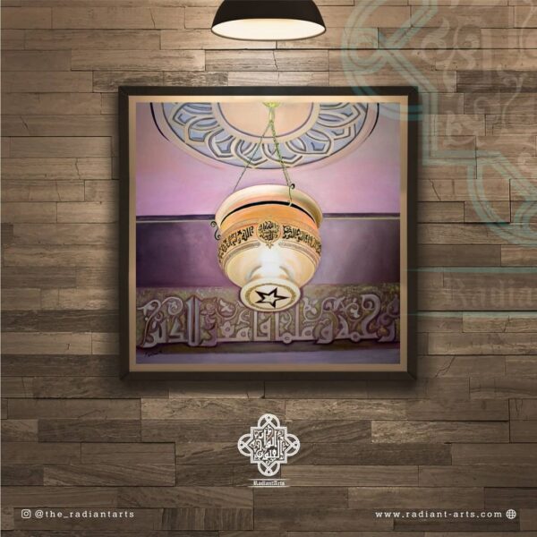 The artist in this panting believes that the mishkat (lantern) is a similitude of the Divine. This similitude is depicted by this medieval glass lamp meant to protect a flame. The work as a whole sees the Divine as a source of light, as spirituality, and is meant to signify humanity’s timeless quest for the Divine.